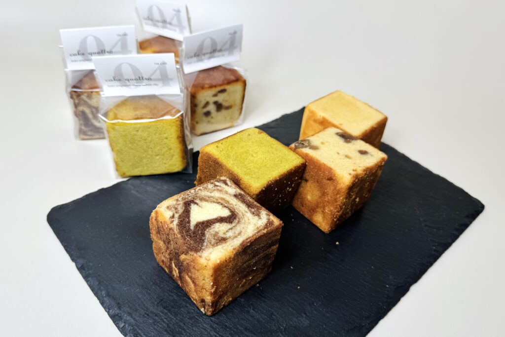 名前の由来は、パウンドケーキの原型「カトルカール」と“四角”の形、そして“4種”の味から。